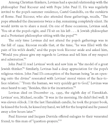 Emmanuel Lévinas was a Litvak (Lithuanian Jew) who immigrated to France where he became a philosopher. He was a pupil of ‘Monsieur Chouchani’ (aka ‘Shushani’) under whom he studied the Talmud. ‘Monsieur Chouchani’ also taught Elie Wiesel as well as abused him. According to Michael Morgan of Indiana University, “Levinas advocates a reading of the Bible through talmudic lenses”. Saint John Paul II was an avid student of Lévinas while Jorge Mario Bergoglio's mentor, Juan Carlos Scannone was strongly influenced by Lévinas. Scannone adopted Lévinas’ concepts of ‘the other’ and ‘face-to-face’ into his ideas which we see reflected in the words and action of Francis.
