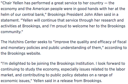 Double-speak about the 71 years old Yellen who spent 17 years in the Federal Reserve system running a Double-entry book with Double-money who is now moving on to cranking out Double-speak for the Double-government of a century-old American research group on Think Tank Row in Washington, D.C.