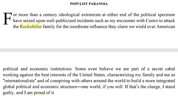 This post makes people ignore the truth when they hear it. Instead Nichlson should have done his homework and posted a real quote like this from David Rockefeller's 2002 book, Memoirs: