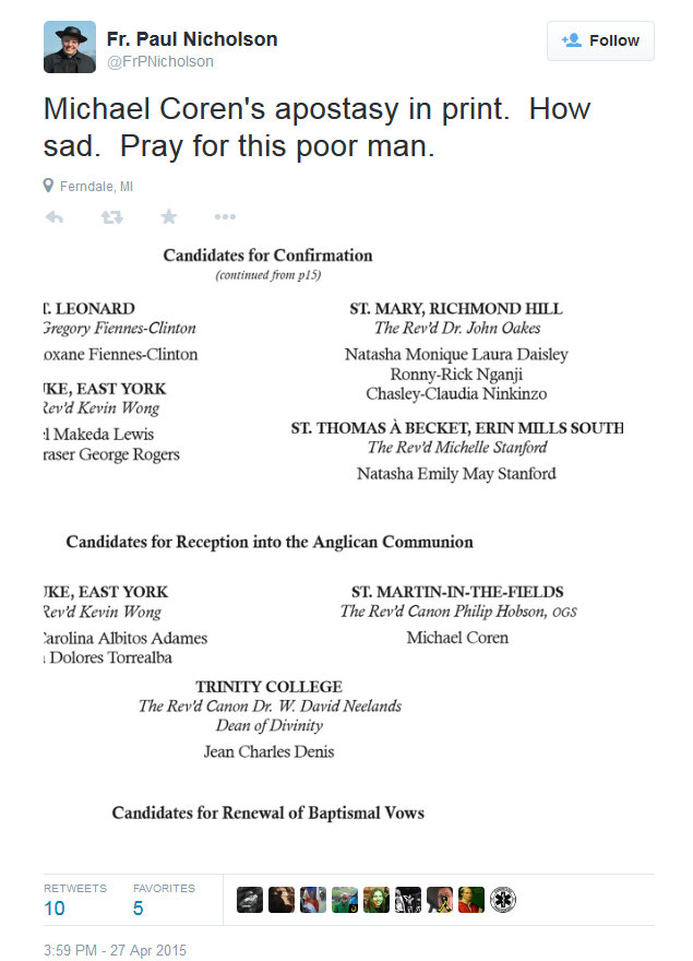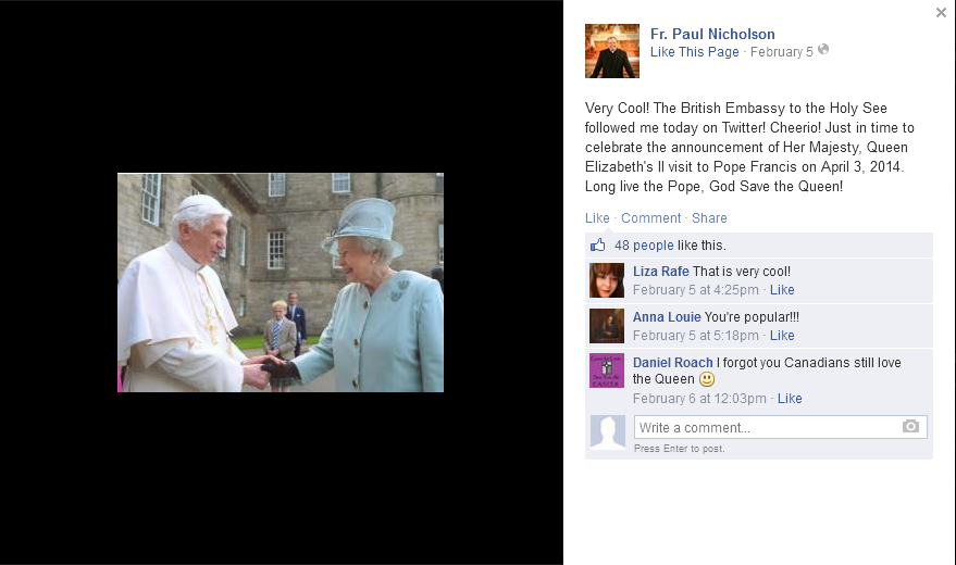 Here he is tweeting about Michael Coren leaving the Church and becoming an Anglican on 27 April 2015. (We at Call Me Jorge... find Coren's apostasy appalling, which is he became an Anglican because they support sodomites.) We find this interesting, Nicholson is a Canadian and therefor a subject of Queen Elizabeth II but he is also a member of the Francis' church. Queen Elizabeth II signed the Marriage Act of 2013 which allows same-sex marriage and has said of same-sex marriage that it is "wonderful". As a Catholic wouldn't it be his duty to have strong words for the Queen of England who is also the head of the Anglican Church when she was planning an upcoming meeting with Francis last year. This isn't Nicholson's only conundrum with those of authority over him. Below is a screenshot of his facebook on 7 February 2014.