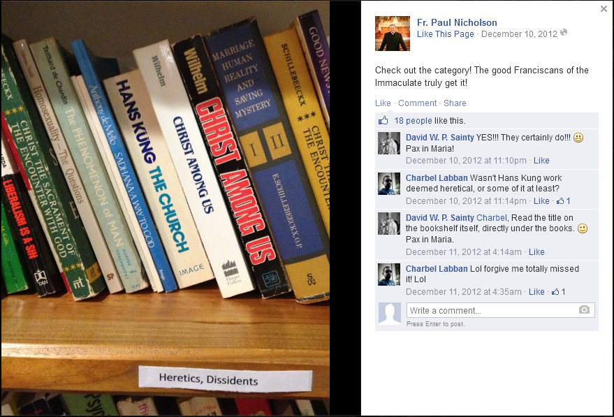 Uh oh, Nicholson supports the Franciscans of the Immaculate. Are they not in Francis' doghouse? Not to worry, Nicholson says it's only a small trivial internal discussion of which way the FFI should go.