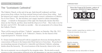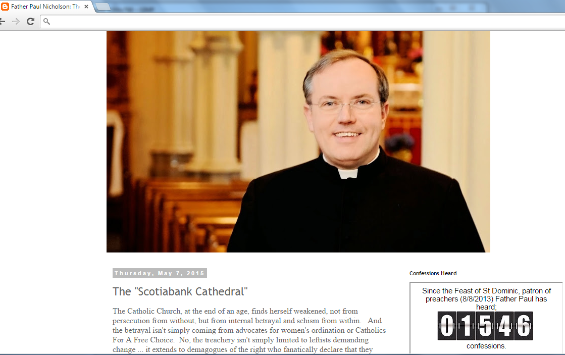 Not content with a few facebook posts, Nicholson wrote a whole entry on his blog on the topic, The "Scotiabank Cathedral". In it among other things, he states Fr. Gruner was suspended from priestly duties. How about some proof Nicholson? Being internet savy, surely it wouldn't take much for you to scan in the documents and link to them which prove this? Or should we just take your word for it?