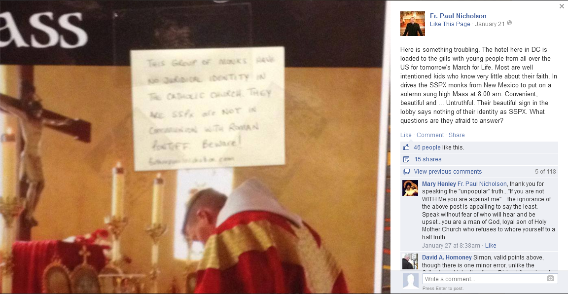 Nicholson even pushes fake news on his facebook page. Putting stories like this up on his facebook page discredits Catholics of all stripes.